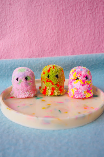 Fat Pom Poms es una marca unipersonal que se centra en accesorios, artículos para el hogar y kits de bricolaje. Jess, la mujer detrás de la marca, lleva fabricando desde 2014, cuando empezó en su ciudad natal de Deal, Kent. Decidió dar el paso después de dejar su título de Psicología y mientras trabajaba junto con su trabajo principal en una cocina. Jess empezó a fabricar pompones, todo tipo de pompones, desde pendientes hasta collares y esculturas, la lista continúa, y con el paso de los años ha ido ampliando poco a poco el uso de materiales para incluir resina epoxi, oropel y purpurina.