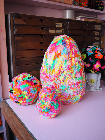 Fat Pom Poms es una marca unipersonal que se centra en accesorios, artículos para el hogar y kits de bricolaje. Jess, la mujer detrás de la marca, lleva fabricando desde 2014, cuando empezó en su ciudad natal de Deal, Kent. Decidió dar el paso después de dejar su título de Psicología y mientras trabajaba junto con su trabajo principal en una cocina. Jess empezó a fabricar pompones, todo tipo de pompones, desde pendientes hasta collares y esculturas, la lista continúa, y con el paso de los años ha ido ampliando poco a poco el uso de materiales para incluir resina epoxi, oropel y purpurina.