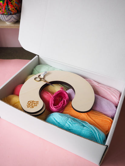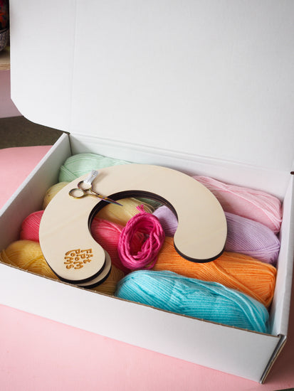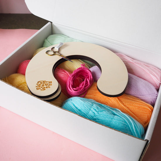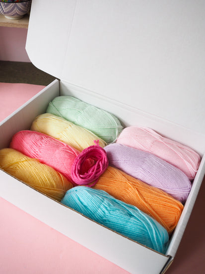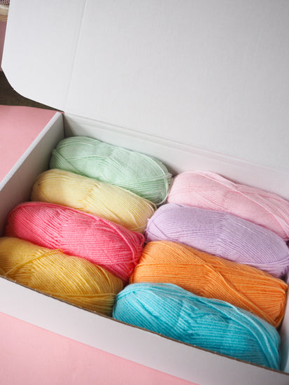 Yarn Included: Pastel Blue, Pastel Pink, Pink, Pastel Yellow, Buttercream Yellow, Lilac, Mint Green, Pale Clementine