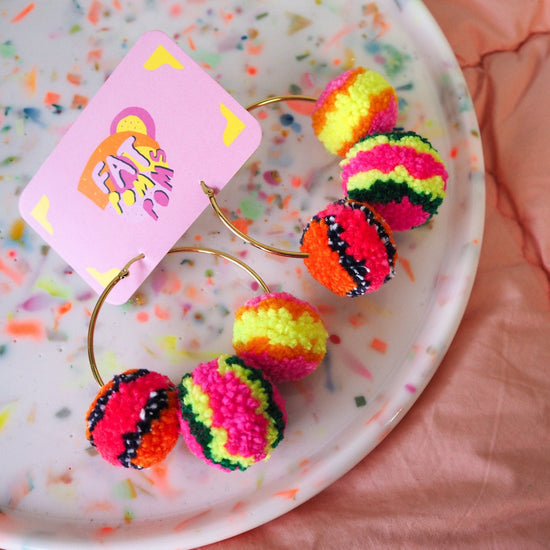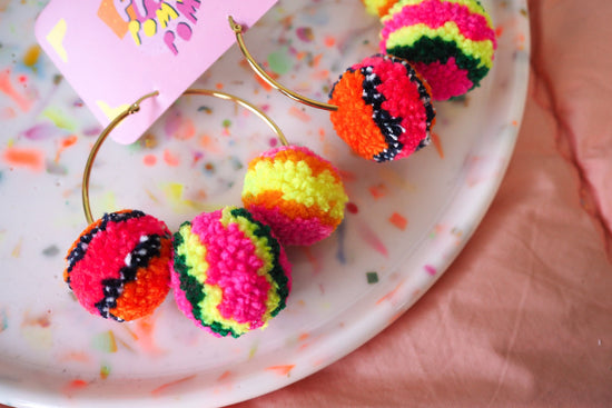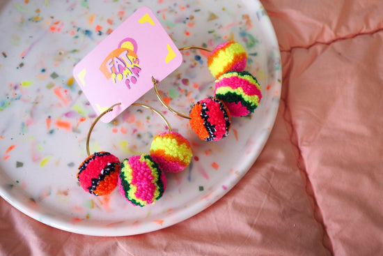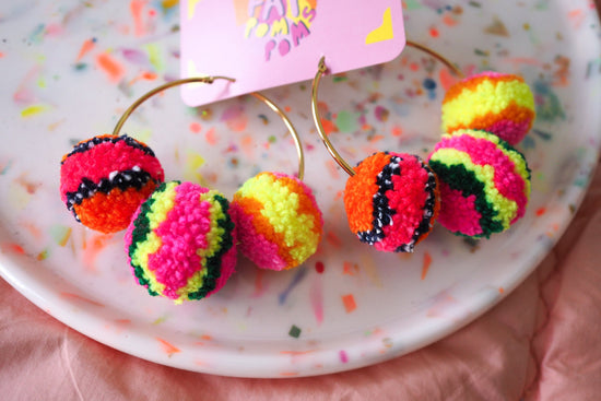 Our Pom Pom earrings were the first things we created back in 2014 and they have been our most steadily popular item since then. Inject some fun into your day and try them out!