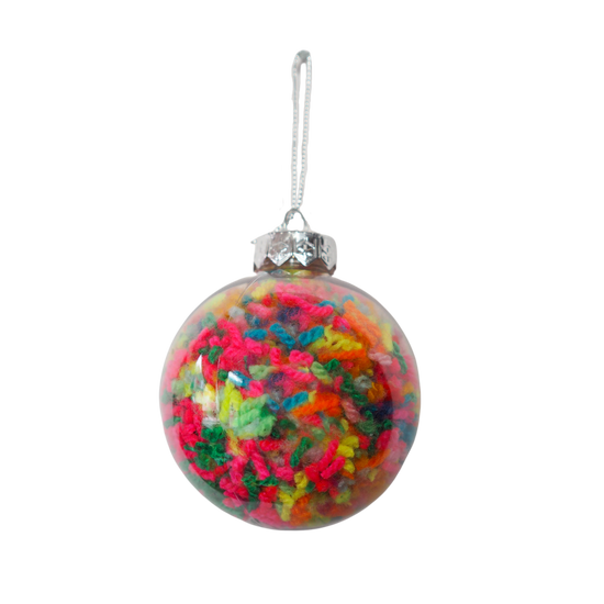 A Glass or Plastic Bauble filled with yarn cuttings from our 'waste' collection.